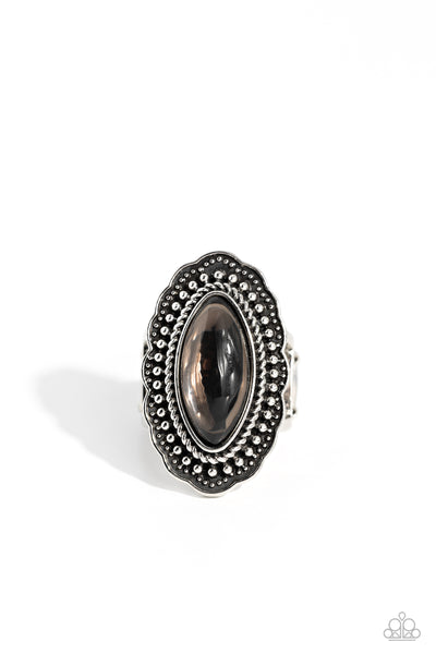 An opalescent smoky marquise-cut bead is pressed into the center of a silver floral frame radiating with studded antiqued textures. Features a stretchy band for a flexible fit.