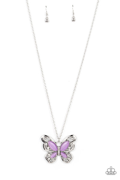 Swirls of silver filigree curl into the shape of a butterfly, creating a whimsical pendant that swings from the bottom of a long silver chain. Glassy purple cat's eye stones layer atop the silver filigree, adding three-dimensional detail and a fresh pop of color, while classic white rhinestones line the center of the design and dot the wings. Features an adjustable clasp closure.