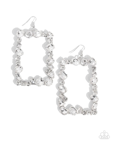 Featuring a collection of highly faceted and reflective white gems in round, oval, square, marquise-cut, triangular, and emerald-cuts, an oversized silver rectangular frame swings from the ear for a refined lure. Earring attaches to a standard fishhook fitting.