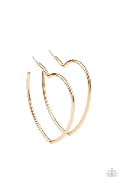 Brushed in a high sheen finish, a glistening gold bar curves into an oversized heart frame for a charming look. Earring attaches to a standard post fitting. Hoop measures approximately 2 3/4" in diameter.