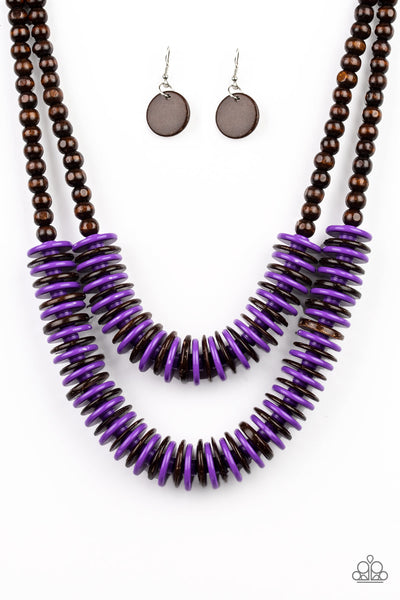 Brown wooden beads give way to rows of purple and brown wooden discs, creating colorful layers for a summery look. Features a button-loop closure.