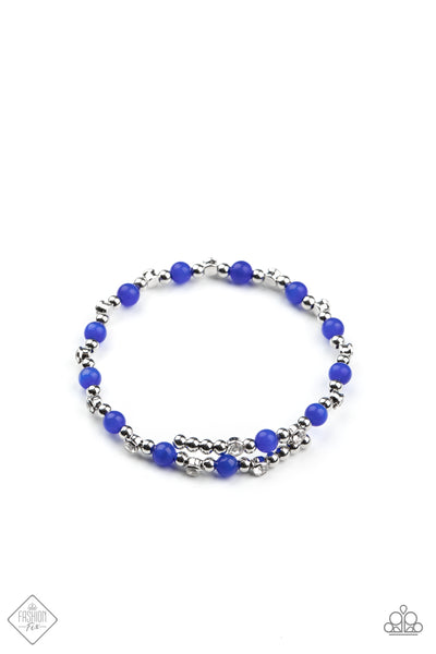 A glittery compilation of glassy white rhinestones, shiny silver beads, and glowing Classic Blue cat's eye beads are delicately threaded along a wire to create an ethereal infinity wrap bracelet.