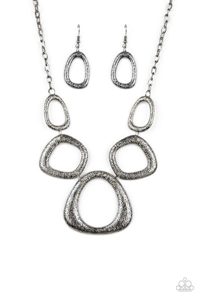 Etched in linear patterns, dramatic gunmetal plates connect below the collar, joining into a fierce crescent-shaped pendant for a statement making look. Features an adjustable clasp closure.