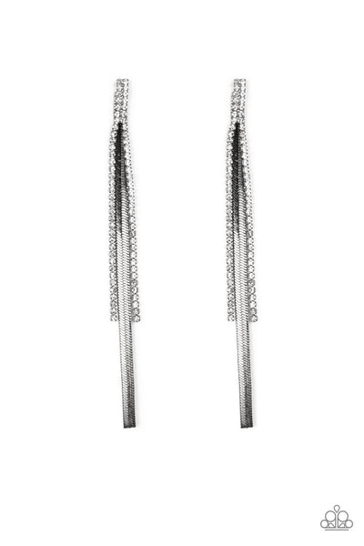 Two strands of dainty white rhinestones join a flat gunmetal chain, coalescing into an edgy lure. Earring attaches to a standard post fitting.