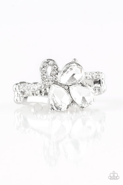 Three white teardrop rhinestones join atop two silver bands, creating a regal centerpiece. Encrusted in glassy white rhinestones, one silver band loops across the finger for a stunning finish. Features a dainty stretchy band for a flexible fit.