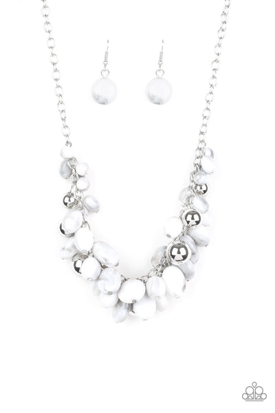 Featuring a smoky finish, a collection of white acrylic beads and shiny silver beads dangle from a classic silver chain, creating a flirtatiously clustered fringe below the collar. Features an adjustable clasp closure.