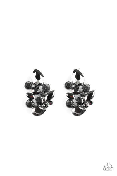 Featuring an array of round, teardrop, and marquise style cuts, a collision of hematite rhinestones explode into a blinding frame. Earring attaches to a standard post fitting.