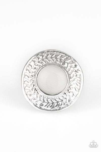 A glowing white moonstone is pressed into a large silver frame embossed in a leafy pattern for a whimsical look. Features a stretchy band for a flexible fit.