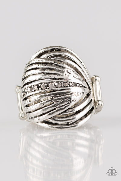 Brushed in an antiqued shimmer, glistening silver frames wrap across the finger for an abstract fashion. A row of dainty hematite rhinestones is encrusted along the folds for a refined finish. Features a stretchy band for a flexible fit.
