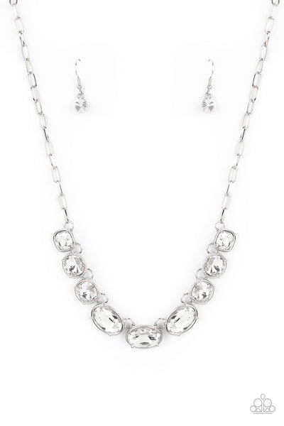 Featuring mismatched round, oval, and square cuts, a glittery row of dramatically oversized white rhinestones delicately link below the collar for an icy finish. Features an adjustable clasp closure.