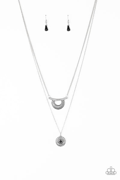 Radiating with linear patterns, a shimmery silver frame swings from the uppermost chain above a silver disc radiating with floral detail. A dainty black bead dots the center of the lowermost pendant for a colorful finish. Features an adjustable clasp closure.