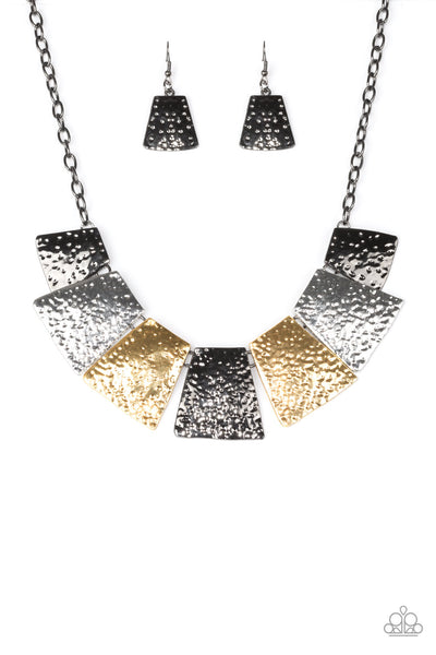Featuring flared edges, delicately hammered gunmetal, silver, and gold plates link below the collar for a fierce look. Features an adjustable clasp closure.
