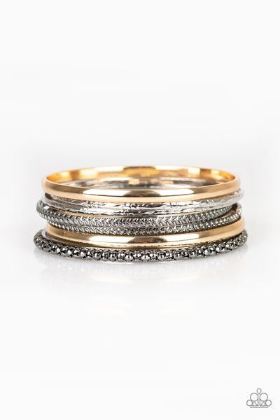 Varying in texture and width, a collision of gunmetal, silver, and gold bangles slide up and down the wrist for a bold, industrial look.
