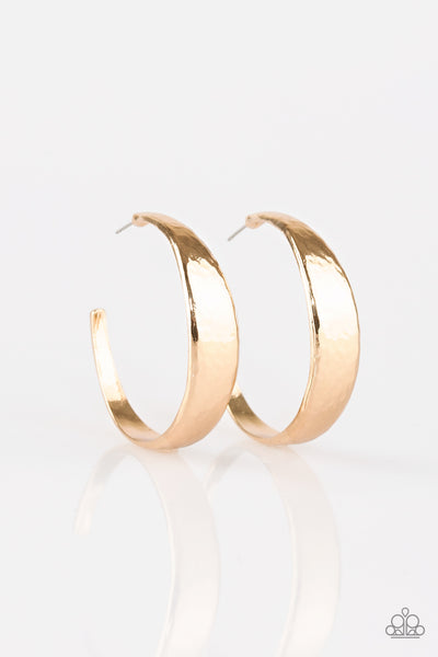 Delicately hammered in shimmery textures, a thick gold hoop curls around the ear for a casual look. Earring attaches to a standard post fitting. Hoop measures 1 3/4" in diameter.