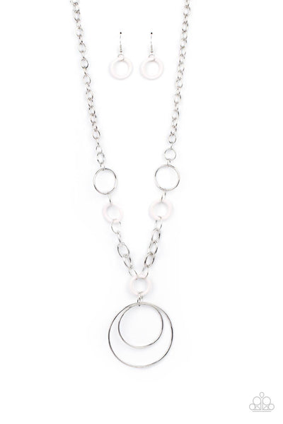 Two generously sized hoops dangle from an oversized chain accented with small white acrylic hoops to create a playful pendant. Features an adjustable clasp closure.