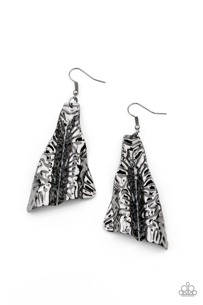Embossed in wavy details, a flared gunmetal frame creases into a rippling lure for an edgy look. Earring attaches to a standard fishhook fitting.