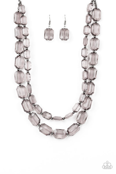Infused with dainty gunmetal beads, smoky emerald-cut beads layer below the collar for an edgy look. Features an adjustable clasp closure.