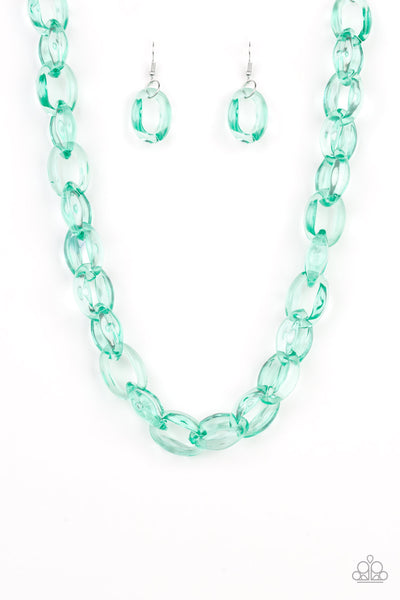 Glassy green links connect below the collar, creating a colorfully, modern chain. Features an adjustable clasp closure.