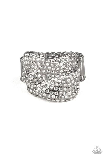 Encrusted in row after row of smoky hematite rhinestones, warped gunmetal bands coalesce into a single sparkling frame across the finger for an edgy look. Features a stretchy band for a flexible fit.