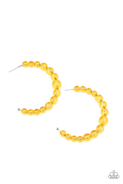 Gradually increasing in size at the center, a glassy collection of Marigold beads are threaded along an oversized hoop for a bubbly effect. Earring attaches to a stand post fitting. Hoop measures approximately 2 1/2" in diameter.