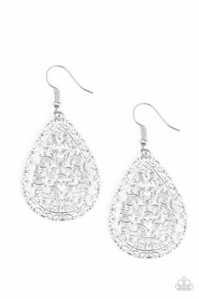 Brushed in a refreshing white finish, vine-like filigree climbs a shimmery silver teardrop for a whimsical look. Earring attaches to a standard fishhook fitting.