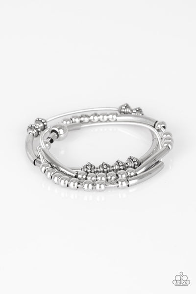 A collection of mismatched silver beads are threaded along three stretchy spring-like wires for a sleek industrial look.