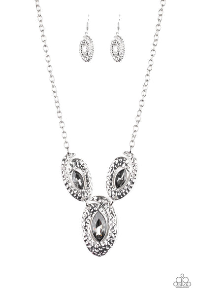 A trio of smoky marquise-cut rhinestones are nestled inside swirls of hammered silver frames, creating a dazzling statement piece below the collar. Features an adjustable clasp closure.