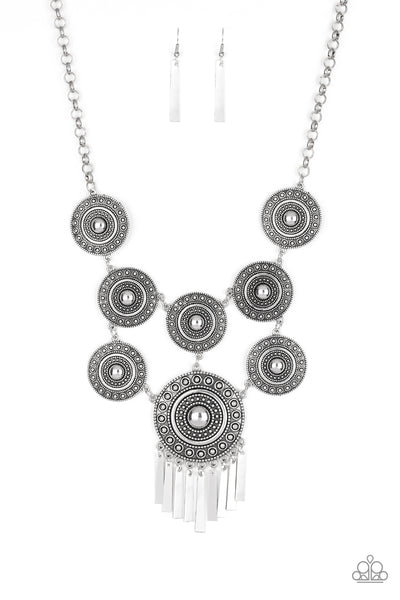 Studded in tactile circular patterns, a collection of antiqued silver disc-like frames connects into a stacked tribal pendant. A larger silver disc is suspended from the bottom, giving way to a fringe of flared silver accents for a noisemaking finish. Features an adjustable clasp closure.