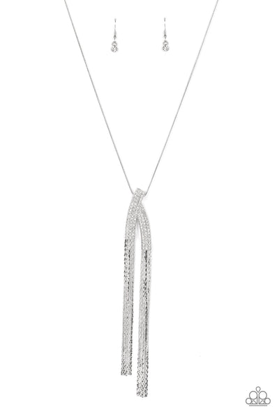 Flat silver chains stream out from the bottom of two overlapping white rhinestone encrusted frames, creating a timelessly twinkling pendant at the bottom of a lengthened silver snake chain. Features an adjustable clasp closure.