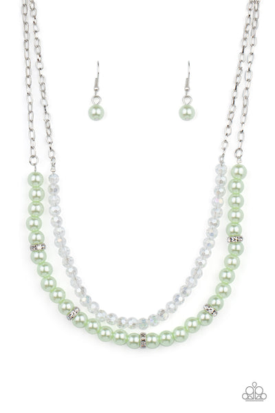 A strand of glassy white crystal-like beads and pearly Green Ash beads and white rhinestone encrusted silver rings layer below the collar, creating a timeless display. Features an adjustable clasp closure.