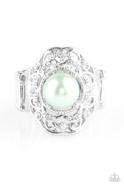 A classic green pearl sits atop a swirling silver frame radiating with white rhinestones, creating a regal finish. Features a stretchy band for a flexible fit.