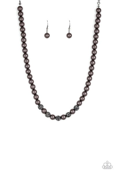 Infused with glittery hematite rhinestone encrusted beads, a strand of pearly gunmetal beads drapes below the collar in a timeless fashion. Features an adjustable clasp closure.