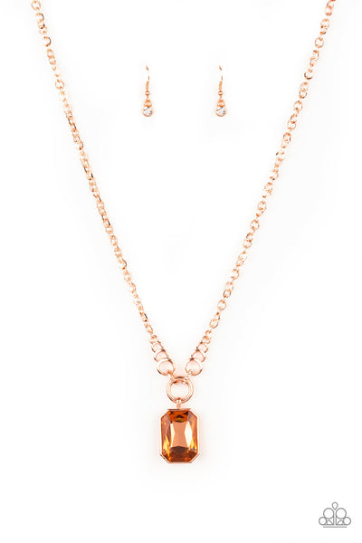 Featuring a regal emerald style cut, an oversized gem swings from the bottom of dramatic white rhinestone encrusted shiny copper fittings for a glamorous look. Features an adjustable clasp closure.