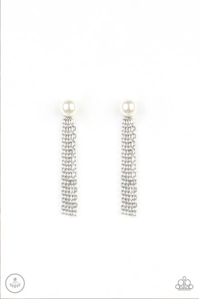 A solitaire white pearl attaches to a double-sided post, designed to fasten behind the ear. Brushed in a high-sheen shimmer, glistening silver chains peek out beneath the ear for a bold tasseled look. Earring attaches to a standard post fitting.
