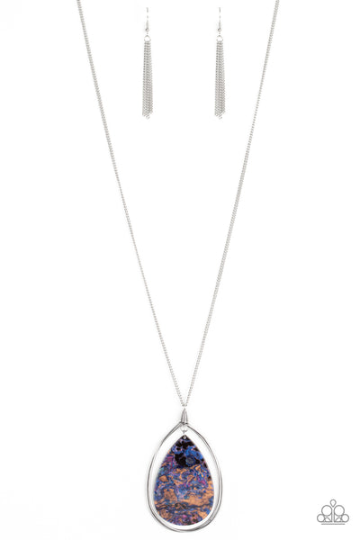 Swirling with an iridescent watercolor background, an acrylic teardrop swings from the bottom of a silver teardrop frame, creating a dreamy pendant at the bottom of a lengthened silver chain. Features an adjustable clasp closure.