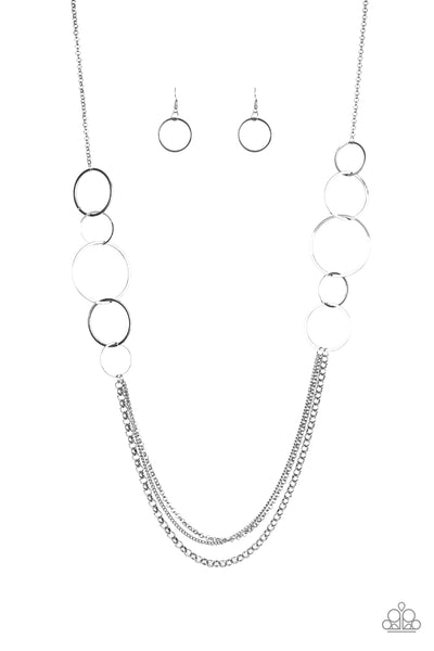 A collection of interlocking gunmetal rings give way to layers of mismatched gunmetal chains down the chest, creating a stunning tone-on-tone statement piece. Features an adjustable clasp closure.
