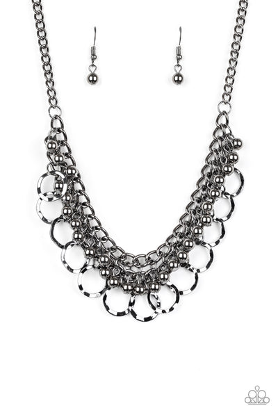 Rows of shiny gunmetal beads and hammered gunmetal rings swing from the bottom of interlocking gunmetal chains, creating a bold fringe below the collar. Features an adjustable clasp closure.