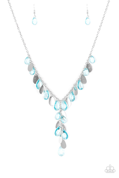 Flat silver teardrops and blue crystal-like teardrops swing from the bottom of a shimmery silver chain below the collar. A matching tassel swings from the center, creating a whimsical extended pendant. Features an adjustable clasp closure.