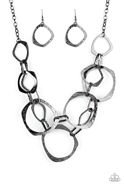 Hammered in shimmery detail, oversized asymmetrical gunmetal rings and gritty gunmetal links boldly link below the collar in two dramatic rows for a sassy industrial look. Features an adjustable clasp closure.