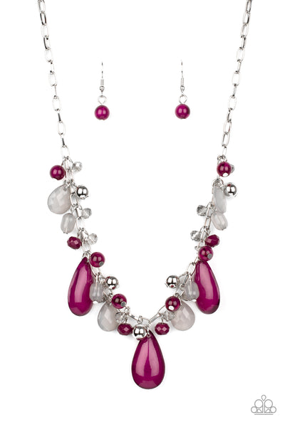 Featuring classic round and tranquil teardrop shapes, a glassy and opaque collection of Magenta Purple, Sleet, silver, and iridescent beads swing from a shimmery silver chain below the collar, creating an enchanting fringe. Features an adjustable clasp closure.