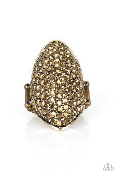 Encrusted in row after row of glittery aurum rhinestones, a dramatic brass frame folds around the finger for a statement-making finish. Features a stretchy band for a flexible fit.