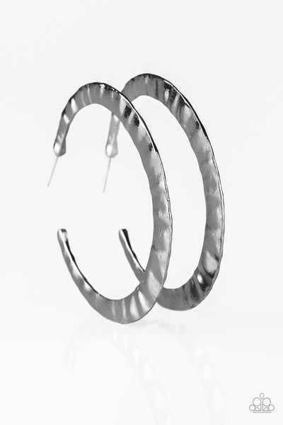 Brushed in a high-sheen finish, a delicately hammered gunmetal hoop curls around the ear for a fierce look. Earring attaches to a standard post fitting. Hoop measures 2 1/2" in diameter.