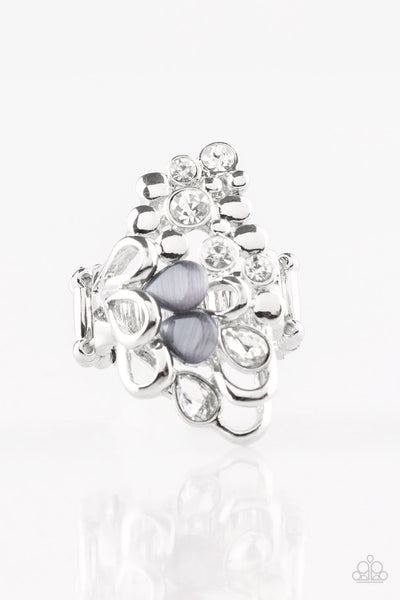 A collision of white rhinestones, flat silver beading, and smoky moonstones coalesce into an undeniable statement piece across the finger. Features a stretchy band for a flexible fit.