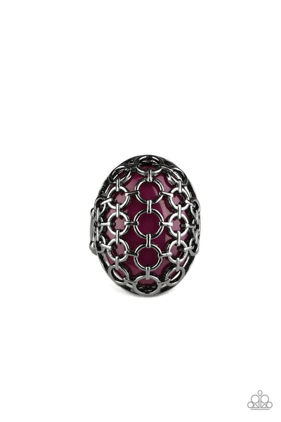 Glistening gunmetal links connect into a wire-like mesh across the front of an oval purple cat's eye stone, creating a bold statement piece atop the finger. Features a stretchy band for a flexible fit.