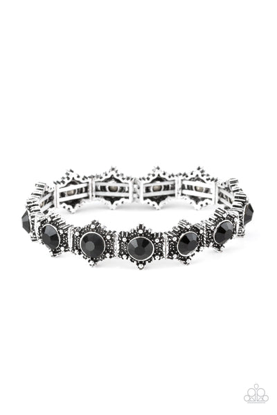 Featuring glittery black rhinestone centers, ornate silver frames are threaded along stretchy bands, linking across the wrist for a refined look.