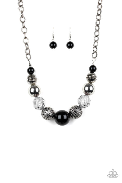 A collection of antiqued silver beads, smoky crystal-like beads, and oversized black beads are threaded along an invisible wire below the collar. Textured in linear patterns, an antiqued silver chain attaches to the colorful compilation for a statement-making finish. Features an adjustable clasp closure.