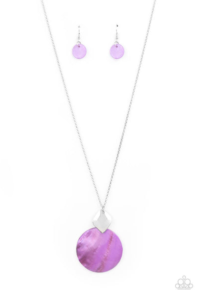 Featuring a glistening iridescence, a Lavender shell-like disc attaches to a shiny silver frame at the bottom of a lengthened silver chain, creating a summery pendant. Features an adjustable clasp closure.