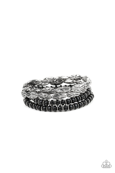 Infused with strands of textured silver beads, an assortment of dainty black beads and studded silver rings are threaded along stretchy bands around the wrist for a whimsical look.