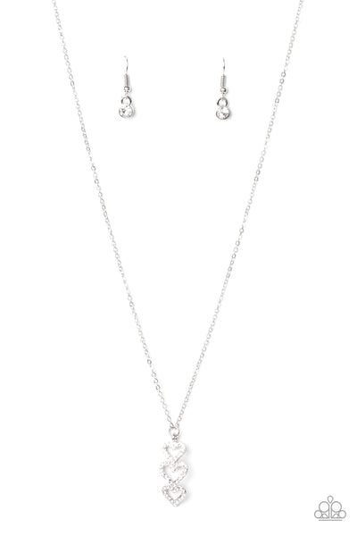 Encrusted in sparkly white rhinestones, a trio of glittery heart frames delicately stack into a charming pendant that swings from a dainty silver chain below the collar for a flirty finish. Features an adjustable clasp closure.